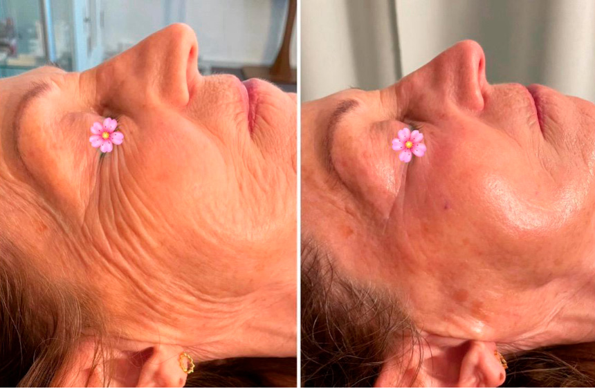 Hele ansigtet, halsen og décolleté behandles med MESO CHEEK LIFT.